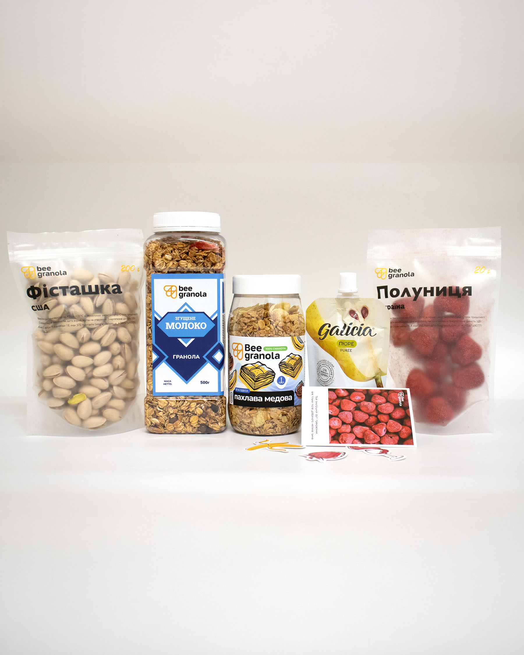 Щільна шкіряна торбинка з улюбленими смаколиками від Bee granola